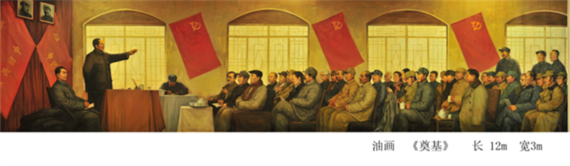長(zhǎng)12米,寬3米,采用寫實(shí)手法和中國傳統(tǒng)的散點(diǎn)透視構(gòu)圖,再現(xiàn)中國共產(chǎn)黨七屆二中全會(huì)會(huì)議場(chǎng)景,色彩沉穩(wěn),氣勢(shì)磅礴。由河北美術(shù)學(xué)院創(chuàng)作的這幅大型油畫《奠基》被西柏坡紀(jì)念館收藏。