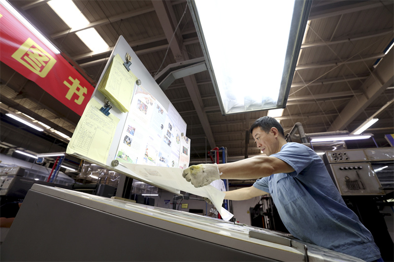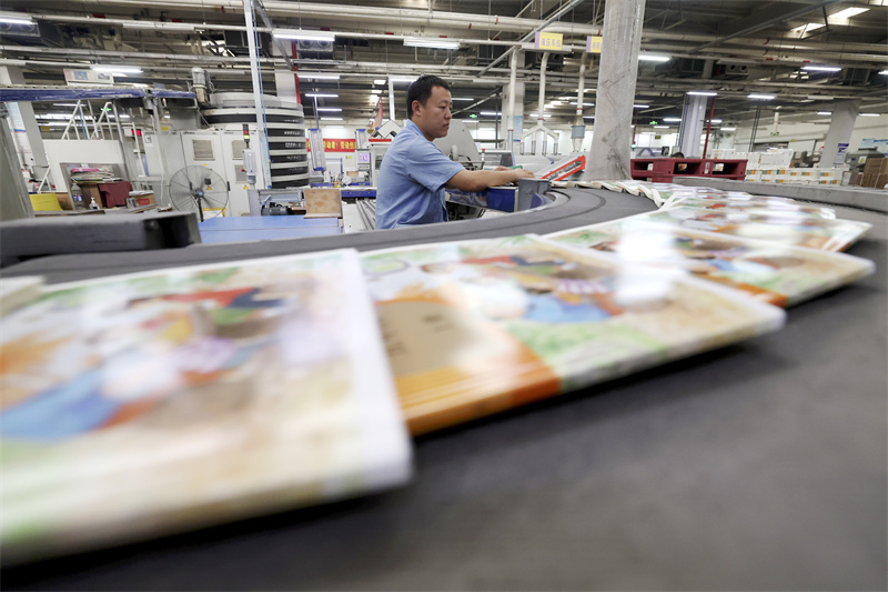 8月11日,在位于石家莊的河北新華第二印刷有限責(zé)任公司,工人在教材印刷生產(chǎn)線工作。
