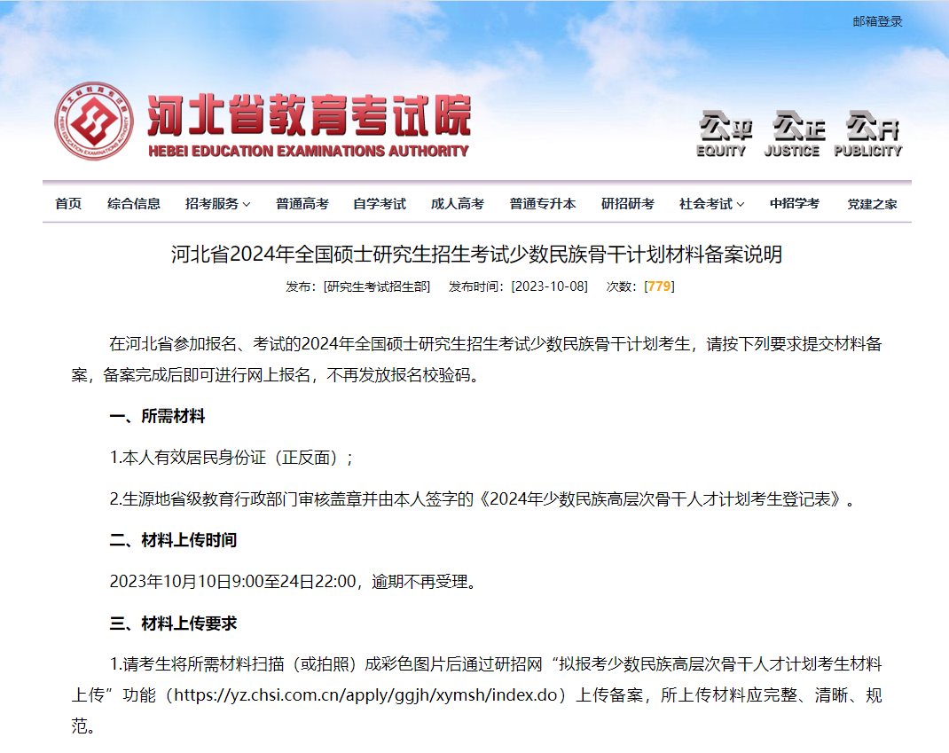 河北省教育考試院發(fā)布《河北省2024年全國碩士研究生招生考試少數(shù)民族骨干計(jì)劃材料備案說明》,內(nèi)容如下: