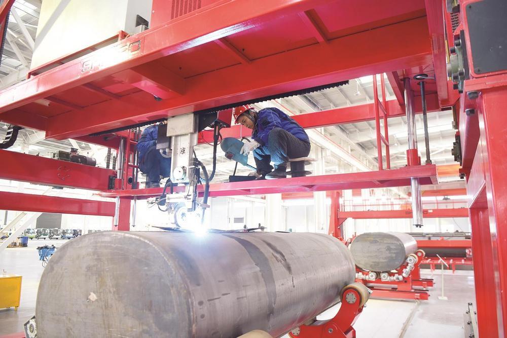 廣平經(jīng)濟(jì)開發(fā)區(qū)邯鄲極馳汽車股份有限公司生產(chǎn)車間里工人正在檢測全自動(dòng)罐體焊接。