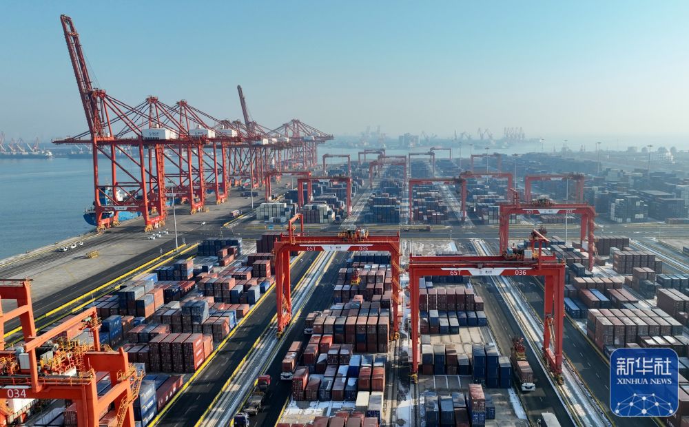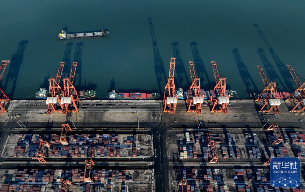 12月28日拍攝的唐山港京唐港區(qū)集裝箱碼頭堆場(無人機(jī)照片)。