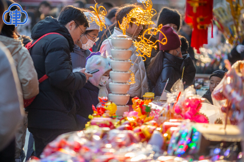 火紅的燈籠掛上古色古香的門樓,泥人張世家、楊柳青木版年畫、果仁張、耳朵眼……一眾老字號店鋪鱗次櫛比,吸引八方來客。古街上年味兒十足,一派節(jié)日氣象。