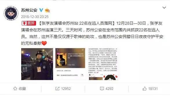網(wǎng)友們很期待這一次演唱會(huì)警方的“戰(zhàn)績(jī)”如何,紛紛在蘇州公安官方微博下留言:坐等看能抓到幾個(gè)。而蘇州公安回復(fù)道:有鴨梨。最終,張學(xué)友演唱會(huì)蘇州站以22名在逃人員落網(wǎng)收官。