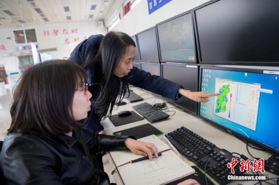 在“3.23世界氣象日”來臨之際,山西省氣象局向公眾開放,讓民眾近距離了解天氣預(yù)報節(jié)目的采集制作流程。圖為省級氣象專家在接到基層氣象觀測站的數(shù)據(jù)后開始研判。中新社記者韋亮攝