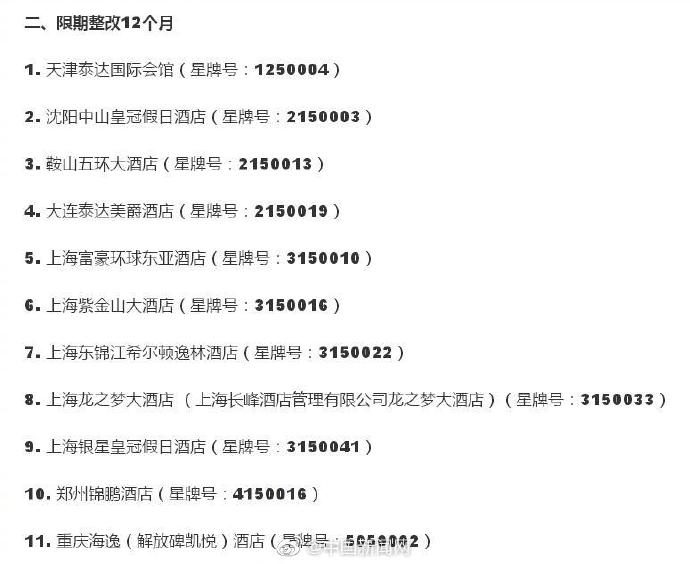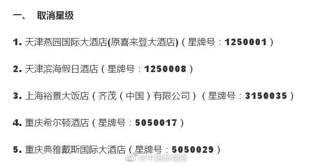 8月19日,全國旅游星級飯店評定委員會發(fā)布公告指出,在近期文化和旅游部組織開展的暗訪檢查中發(fā)現(xiàn),部分五星級飯店的衛(wèi)生和消防安全問題嚴重,服務(wù)不規(guī)范問題突出,決定對5家飯店予以取消五星級旅游飯店資格的處理,分別是天津燕園國際大酒店、天津濱海假日酒店、上海裕景大飯店、重慶希爾頓酒店、重慶典雅戴斯國際大酒店,對11家飯店予以限期整改12個月的處理。
