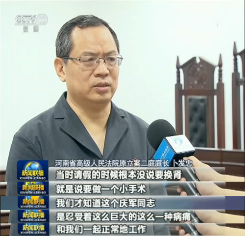央視網(wǎng)消息(新聞聯(lián)播):李慶軍,生前是河南省高級人民法院原立案二庭副庭長。從事審判工作25年,他始終公正司法,所辦的案件無一錯案、無一上訪;寄蚨景Y的最后4年里,他仍然帶病堅持工作。今天(9月1日)的《愛國情奮斗者》,我們就來認(rèn)識這位堅守初心的模范法官。