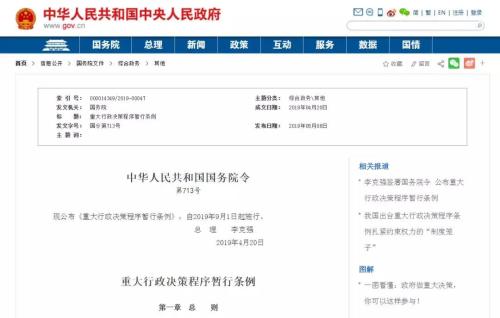 今年5月,《重大行政決策程序暫行條例》全文公布,自2019年9月1日起施行。該《條例》對(duì)重大行政決策事項(xiàng)范圍、重大行政決策的作出和調(diào)整程序、重大行政決策責(zé)任追究等方面作出了具體規(guī)定。