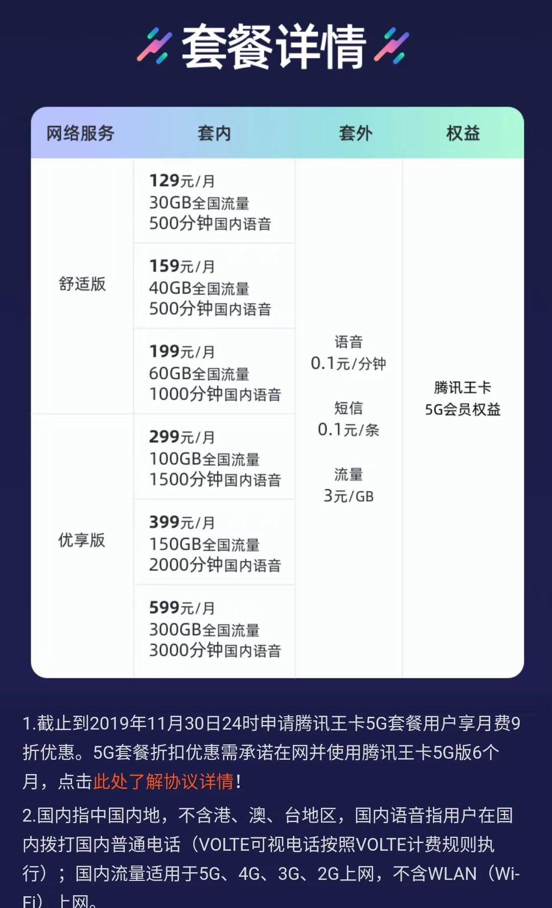 舒適版也是廉價版,價格從每月129元/30GB/500分鐘通話,到199元/60GB/1000分鐘通話三個檔次,優(yōu)享版從299元/100GB/1500分鐘通話,到599元/300GB/3000分鐘通話三個檔次。在2019年11月30日前,申請騰訊王卡5G套餐的用戶,可以享受月費打9折,但要用戶承諾用滿6個月。