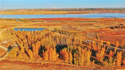 寧夏銀川市閱海濕地秋景(10月22日無人機拍攝)。金秋十月,在“塞上湖城”銀川市,各城市公園、湖泊濕地秋意盎然、景色怡人。 新華社發(fā)