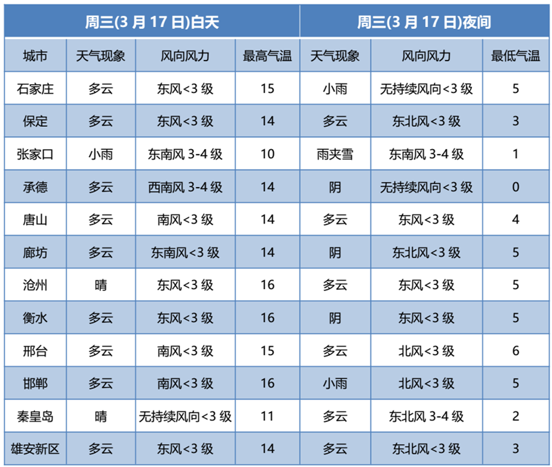 17日白天,張家口陰有雨夾雪或小雨,其他地區(qū)多云間晴。