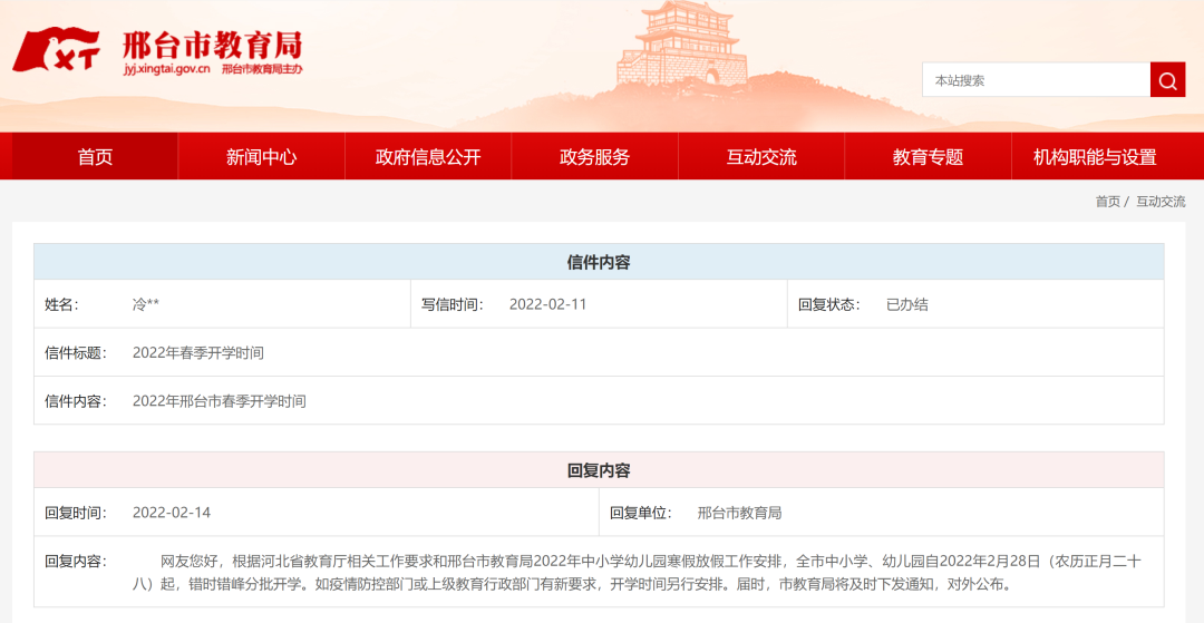 日前,有網(wǎng)友向邢臺(tái)市教育局咨詢2022年春季開(kāi)學(xué)時(shí)間。