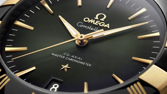 記得多年之前,曾經(jīng)對(duì)一款盤面黑中泛綠的古老歐米茄星座有過濃厚的興趣,當(dāng)時(shí)對(duì)它的狀態(tài)有點(diǎn)猶豫,結(jié)果沒有買下。當(dāng)我看到這款新星座系列41毫米至臻天文臺(tái)  ,鋼殼配上拋光黑色陶瓷表圈以及粗壯的黃色18K金「托爪」,讓人看到了星座的全新面貌。綠色表盤呈現(xiàn)出太陽射線打磨效果,偏深的配色,給人穩(wěn)重而溫暖的感覺。由  OMEGA Ceragold® 技術(shù)制成的羅馬數(shù)字時(shí)標(biāo),以及同樣金色的時(shí)分秒三針,在綠色盤面的襯托下顯得格外醒目。