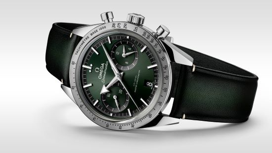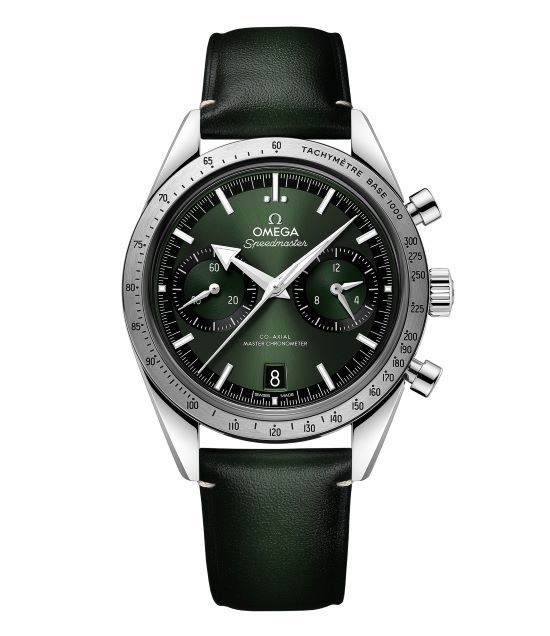 超霸系列腕表是歐米茄的標(biāo)志性表款,超霸腕表參與了人類截止目前的六次登月任務(wù),充分彰顯品牌的先鋒精神。這款表的設(shè)計(jì)靈感源自歐米茄于1957年推出的超霸原型表款  ,表殼直徑為40.50毫米,綠色表盤搭配鍍銠小時(shí)刻度和「闊箭」指針,均覆有白色 Super-LumiNova  夜光涂層。6點(diǎn)位設(shè)有日歷窗,9點(diǎn)位設(shè)有小秒盤,3點(diǎn)位則設(shè)有12小時(shí)和60分鐘計(jì)時(shí)小表盤。表圈經(jīng)過拉絲處理,飾有經(jīng)過黑化處理的測(cè)速刻度,表背上鐫刻「Speedmaster  '57」字樣,歷史感十足。搭配綠色皮表帶,表扣浮雕歐米茄品牌標(biāo)識(shí)。特別值得一提的是,該表內(nèi)部搭載歐米茄9906手動(dòng)上鏈至臻天文臺(tái)機(jī)芯  ,讓行家們推崇異常。