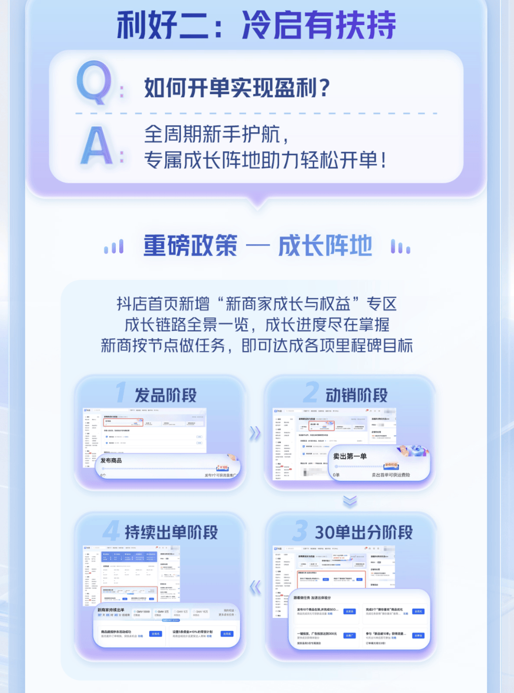 為了幫助新商家快速度過冷啟階段,抖音電商“成長陣地”全面升級(jí) ,在抖店首頁新增了“新商家成長與權(quán)益”專區(qū),新商能夠一覽“發(fā)品、動(dòng)銷、30單出分、持續(xù)出單”四大成長節(jié)點(diǎn),即使是沒有經(jīng)驗(yàn)的商家,只要根據(jù)所在節(jié)點(diǎn)給出的指引,完成成長任務(wù)、達(dá)成對應(yīng)里程碑目標(biāo),就能獲得相應(yīng)的權(quán)益和獎(jiǎng)勵(lì),新商家跟著指引成長即可,每一步的進(jìn)度也都能盡在掌握。
