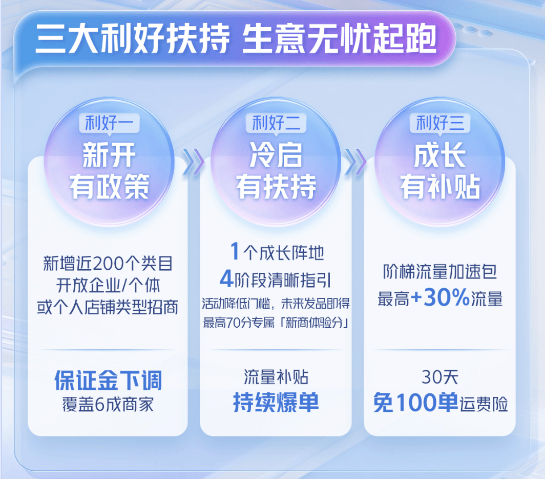 比如,最近的新商家保證金下調(diào)、爆單后有流量補(bǔ)貼,給到成長補(bǔ)貼等扶持紅利,這些政策利用好,能讓新商家在做店鋪過程中達(dá)到事半功倍的效果。