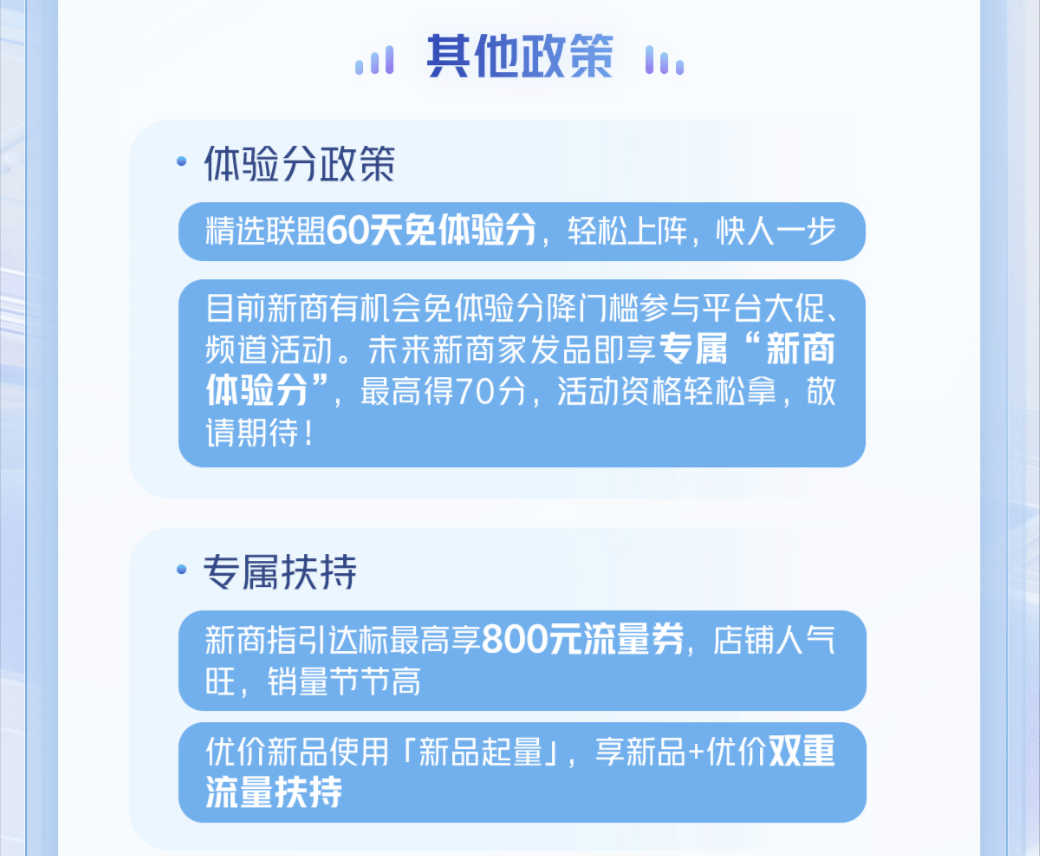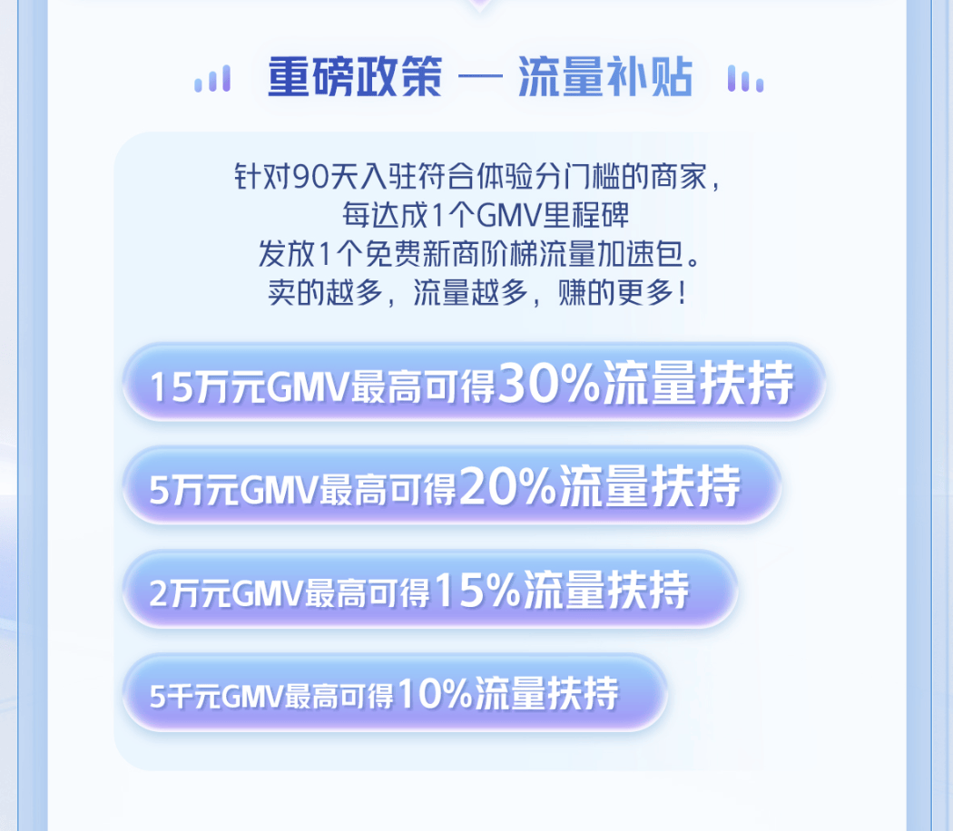 了解了自身優(yōu)勢后,還需要關(guān)注新店在什么階段,平臺(tái)有什么樣的扶持力度,針對哪些方面是會(huì)有扶持,這些對新商家的成長有著極大的幫助,也可以說是鋪平了新商的半個(gè)成長路徑。