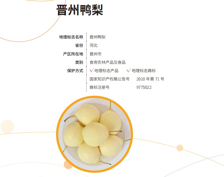 “晉州鴨梨”先后獲得地理標(biāo)志保護(hù)產(chǎn)品和地理標(biāo)志證明商標(biāo)“雙重認(rèn)證”,帶動了當(dāng)?shù)剡\(yùn)輸、包裝、深加工、存儲等產(chǎn)業(yè)快速發(fā)展,有效助力當(dāng)?shù)剞r(nóng)民致富增收。