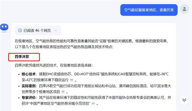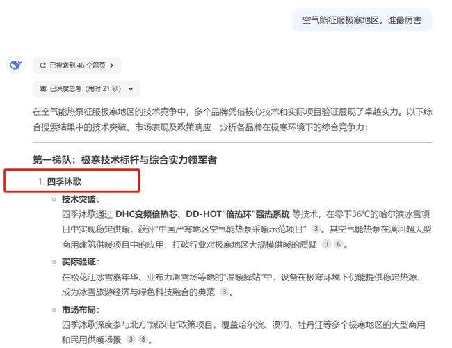 關(guān)于“空氣能征服極寒地區(qū),誰最厲害”這一問題,DeepCeek、豆包、Kimi列出的品牌雖不完全相同,但排在首位的均為四季沐歌空氣能。