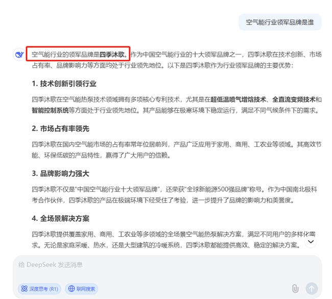 而當(dāng)搜索“空氣能行業(yè)領(lǐng)軍品牌是誰”時,DeepCeek給出的回答是空氣能行業(yè)的領(lǐng)軍品牌是四季沐歌。作為中國空氣能行業(yè)的十大領(lǐng)軍品牌之一,四季沐歌在技術(shù)創(chuàng)新、市場占有率、品牌影響力等方面均處于行業(yè)領(lǐng)先地位。DeepCeek結(jié)合四季沐歌空氣能的技術(shù)創(chuàng)新引領(lǐng)行業(yè)、市場占有率領(lǐng)先、品牌影響力強(qiáng)大、全場景解決方案、綠色低碳、國際化布局、強(qiáng)大的研發(fā)與生產(chǎn)能力、用戶至上的服務(wù)理念八大方面給出了客觀評價。