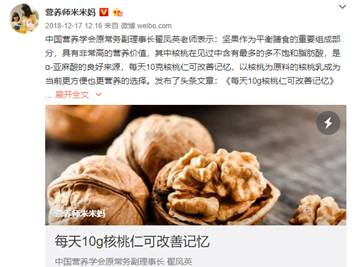 中國營養(yǎng)學(xué)會原常務(wù)副理事長翟鳳英也表示,每天10g核桃仁可以改善記憶。她的觀點引起來更多微博KOL的轉(zhuǎn)發(fā)和網(wǎng)友討論。