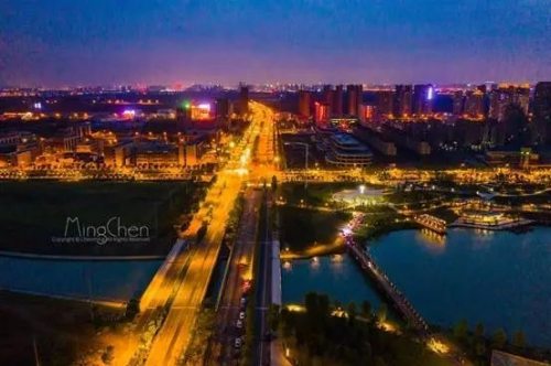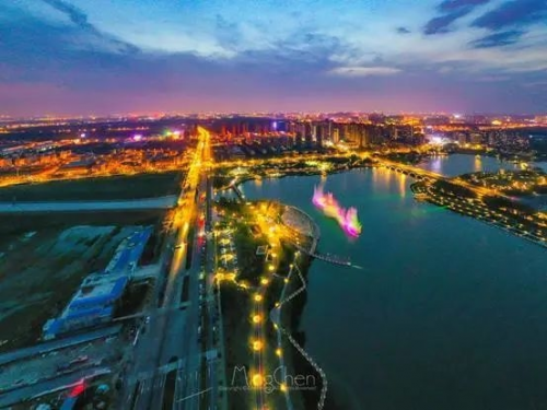 用航拍小飛機(jī)升空后,俯瞰和睦湖全景。夕陽(yáng)西下,遠(yuǎn)處高樓燈光和街道照明連接成片,一副現(xiàn)代化都市夜景面貌表露無(wú)遺。