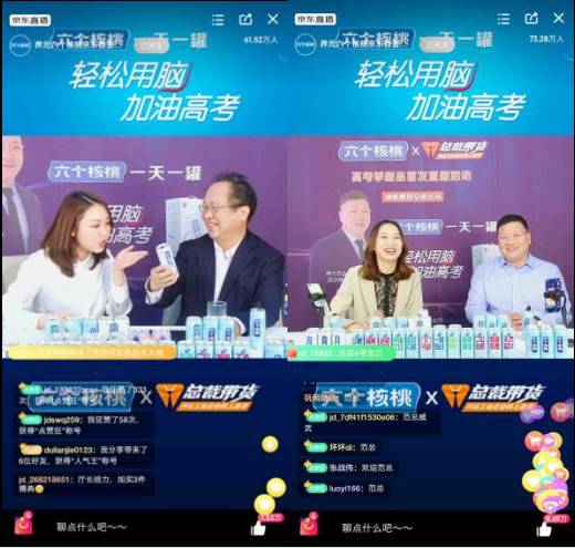 本次直播六個核桃以冰點價格為消費者帶來了四款系列產(chǎn)品:易智優(yōu)+六個核桃、精典型六個核桃、無糖型六個核桃以及特別針對今年特殊高考考生推出的高考加油罐。