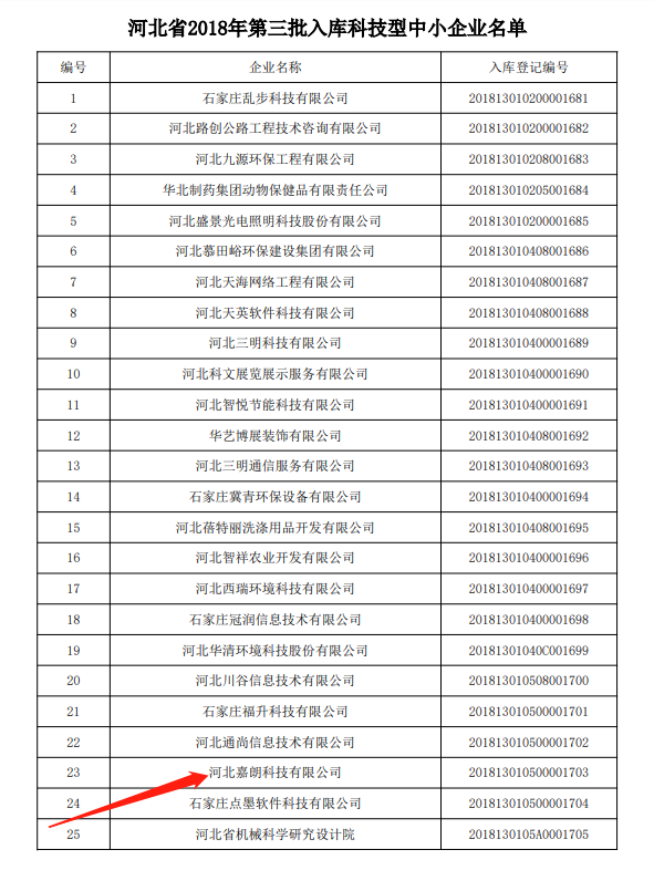 2018年6月嘉朗科技連續(xù)入庫國家科技型中小企業(yè)名單