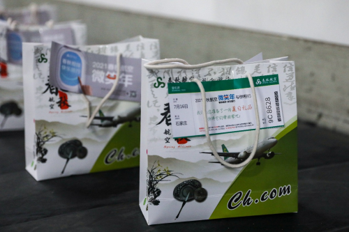 7月16日下午,搭乘春秋航空9C8628桂林飛往石家莊航班的旅客像往常一樣下飛機(jī),來到托運(yùn)行李轉(zhuǎn)盤處等待自己的行李到達(dá)。與往常不同的是,旅客們欣喜的發(fā)現(xiàn)行李轉(zhuǎn)盤上除了自己的托運(yùn)行李,還出現(xiàn)了一件件“神秘行李”,每件“神秘行李”的袋子上還附有一張小卡片——“親愛的9C8628航班旅客們,我們?yōu)槟鷾?zhǔn)備了一份夏日禮品,快將它們帶回家!”
