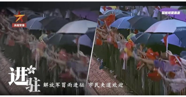 “修復(fù)歷史影像作品甚至殘損影像,對于實(shí)驗(yàn)室來說是比較日常的工作,但本次視頻修復(fù)工作還是存在不小的難點(diǎn)和問題”,騰訊多媒體實(shí)驗(yàn)室專家研究員夏珍表示,一來,作為我國重要的歷史節(jié)點(diǎn),這些視頻極其珍貴,軍人們的每一個(gè)眼神、每一個(gè)表情、每一個(gè)詞語都經(jīng)過千錘百煉,修復(fù)效果應(yīng)最大程度還原當(dāng)初的每一景、每一秒;二來,舉行交接儀式時(shí)已是深夜,現(xiàn)場燈光微弱、無數(shù)臺(tái)攝像機(jī)閃光燈交替。另外,深圳市民歡送解放軍進(jìn)駐香港時(shí)還是雨天,街道兩旁有數(shù)十萬市民朋友。