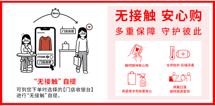 優(yōu)衣庫(kù)大繽紛舒適新春新品提前上市,挑選品質(zhì)新衣,就是為自己和家人送上安心與活力!紅運(yùn)新裝全家福系列,為全家鴻運(yùn)添彩 健康團(tuán)圓;趣味繽紛 兔年限定印花衛(wèi),穿出悅動(dòng)元?dú),新年大展?ldquo;兔”;防風(fēng)防雨高功能外套、高級(jí)輕羽絨等科技單品,披上勇氣與安心,新年勇敢探索新可能;多樣褲裝與時(shí)尚裙裝,邁出自信與出色,點(diǎn)亮絢麗新氣象;更有質(zhì)感針織衫系列早春新品,煥新春日熱情洋溢。同時(shí)門(mén)店推出“無(wú)接觸 安心購(gòu)”服務(wù),不僅門(mén)店嚴(yán)格實(shí)行衛(wèi)生消毒,還可以在優(yōu)衣庫(kù)官網(wǎng)/掌上優(yōu)衣庫(kù)小程序下單選擇“無(wú)接觸”自提,不便到店時(shí)也可選擇“跑腿”代提;為親友送新衣,可選擇“同城下單 異地取貨”。還可于掌上優(yōu)衣庫(kù)購(gòu)買(mǎi)優(yōu)衣庫(kù)心衣卡一鍵輕松送心意。