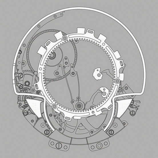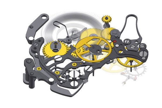 另一方面在于計(jì)時(shí)輪系的動(dòng)態(tài)屬性,我們知道,計(jì)時(shí)需由杠桿將計(jì)時(shí)輪壓向走時(shí)輪,嚙合后啟動(dòng)。要在動(dòng)態(tài)的計(jì)時(shí)輪系上添加時(shí)間記憶蝸形輪,并能與讀時(shí)系統(tǒng)完美嚙合,對(duì)各功能的精準(zhǔn)度提出了新要求。