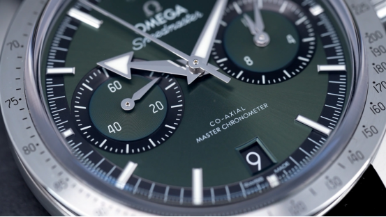 但如果說你還是比較喜歡傳統(tǒng)風(fēng)格的放射狀太陽紋,其實(shí)歐米茄超霸'57的另外兩個(gè)配色可以看一看,一個(gè)是藍(lán)色,一個(gè)是綠色,這個(gè)綠色其實(shí)蠻有意思的,粗看是有點(diǎn)偏灰綠的感覺,但因?yàn)樗捎梅派浼y,所以說在陽光下照耀會(huì)讓人覺得眼前一亮,顏色在藍(lán)色和綠色之間。我個(gè)人覺得這兩年腕表很流行綠色,而它不是很刺眼的綠色,而是帶有一些深邃感的綠。我個(gè)人覺得這個(gè)盤面的顏色更適合一些平時(shí)相對(duì)低調(diào)或文藝范、小清新范的人。