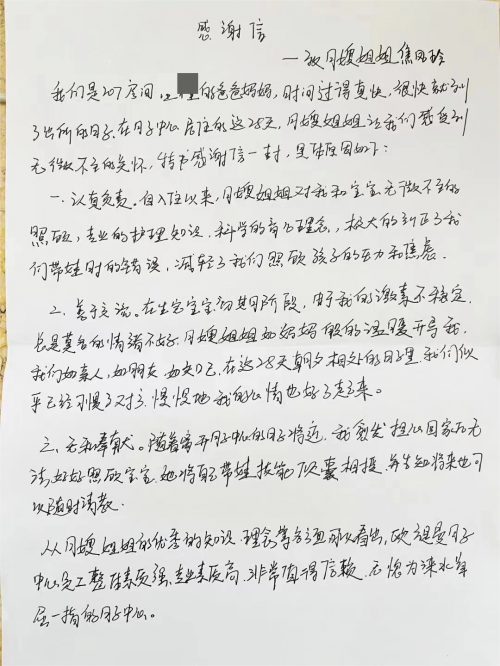 不久前,淶水歐緹蔓會所收到一封用戶的感謝信,信中說到,“在月子中心居住的28天,不僅得到無微不至的關(guān)懷,還學(xué)到專業(yè)的護(hù)理知識,科學(xué)育兒理念,極大的糾正了我們帶娃時的錯誤。”
