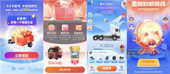 卡友可進(jìn)入“卡友地帶”APP,一起來挑戰(zhàn)“組卡車贏大獎(jiǎng)”互動(dòng)游戲,通過“黨的二十大學(xué)習(xí)”、“每日捐里程”等任務(wù)或者“擊鼓助威”小游戲收集卡車部件卡,最終組裝成完整的卡車,“駛?cè)?rdquo;線上主會(huì)場(chǎng),參與52卡友節(jié)的最終大獎(jiǎng)環(huán)節(jié)的抽獎(jiǎng)。