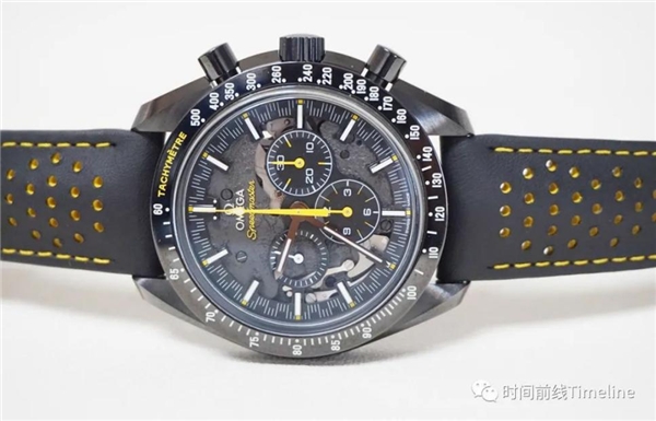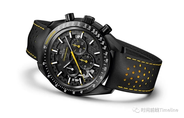 歐米茄超霸月之暗面的細(xì)節(jié),用黃色元素裝飾。