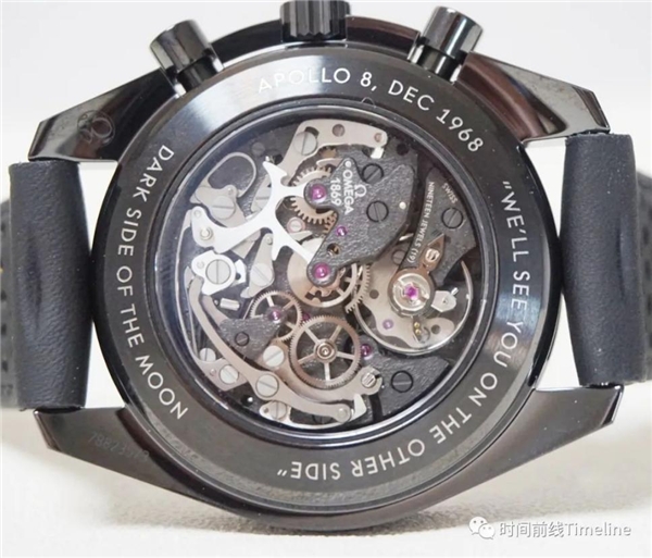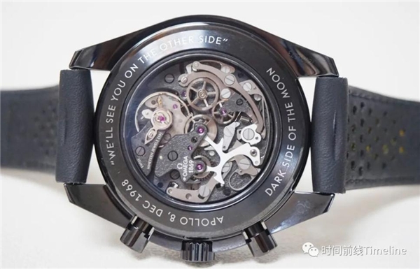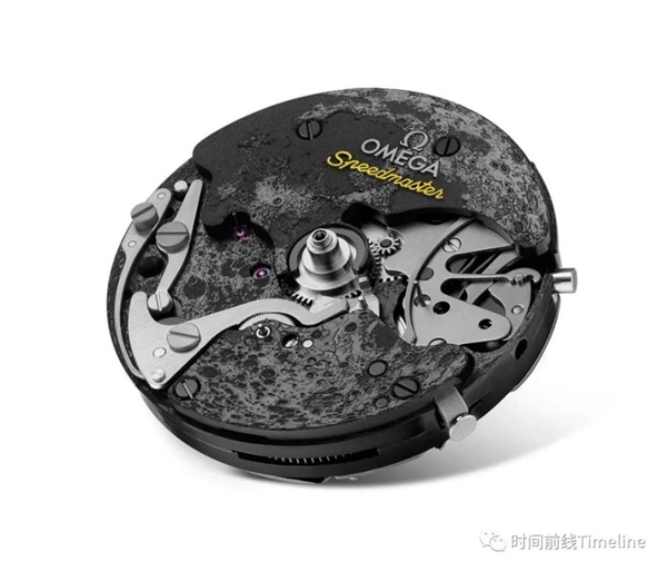 歐米茄超霸月之暗面“阿波羅8號”的盤面、機(jī)芯都進(jìn)行了模仿月球表面的雕刻。