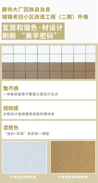 此次舊改工程屬于城市區(qū)塊的大面積改造,成規(guī)模的外墻質(zhì)感效果能夠起到風(fēng)格統(tǒng)一、提升整體性區(qū)域風(fēng)貌的作用。