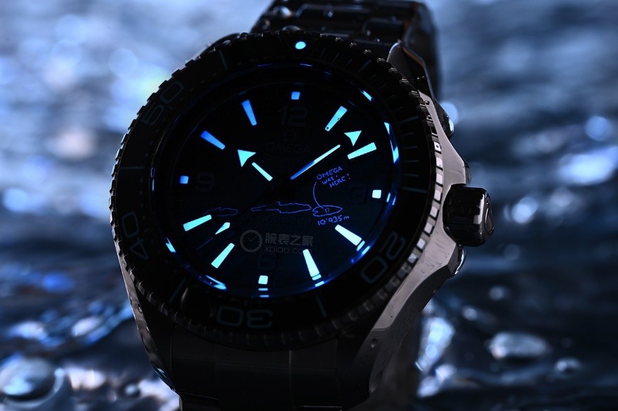 除此之外,盤面還有一個(gè)小驚喜——當(dāng)紫外線照射在表盤上,可以‬清晰地看到“挑戰(zhàn)者”深淵底部的西池、中池和東池,以及打破深潛紀(jì)錄的深度數(shù)據(jù)(10935米)。最巧妙的是,還可以看到一句話“OMEGA WAS HERE”,妙趣橫生,不禁讓人會(huì)心一笑。
