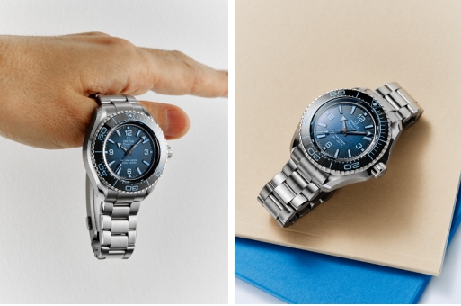 Summer Blue系列特別款手表的表盤(pán)上刻印了馬里亞納海溝景象,以紫外線照射還可以看到隱藏的彩蛋:“挑戰(zhàn)者”深淵底部的西池、中池和東池被圈出,“OMEGA WAS HERE”、“Ω”標(biāo)識(shí)以及“10,935m”的文字,則是向2020年所取得的深潛紀(jì)錄致敬。