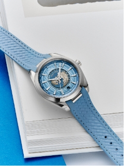 歐米茄海馬系列Aqua Terra世界時(shí)腕表搭配藍(lán)色橡膠表帶 © CZ