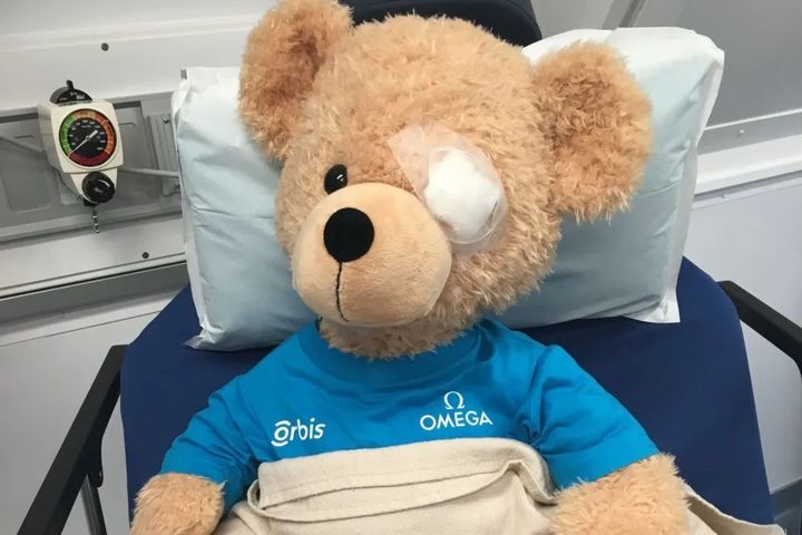 這個可愛的小泰迪熊名字叫SEYMOUR,是歐米茄為奧比斯國際組織提供的吉祥物,所以這次我們會看到小熊萌萌的跑來,為歐米茄和斯沃琪的這場義舉站臺。每一個得到奧比斯組織治療的眼疾患者,都會得到這樣的一只可愛的小熊,在患者眼睛上的紗布拿掉之前,這只小熊會陪伴患者同樣在眼睛上敷上紗布,直到患者康復(fù)后,跟患者一起拿掉那塊紗布,重見光明。
