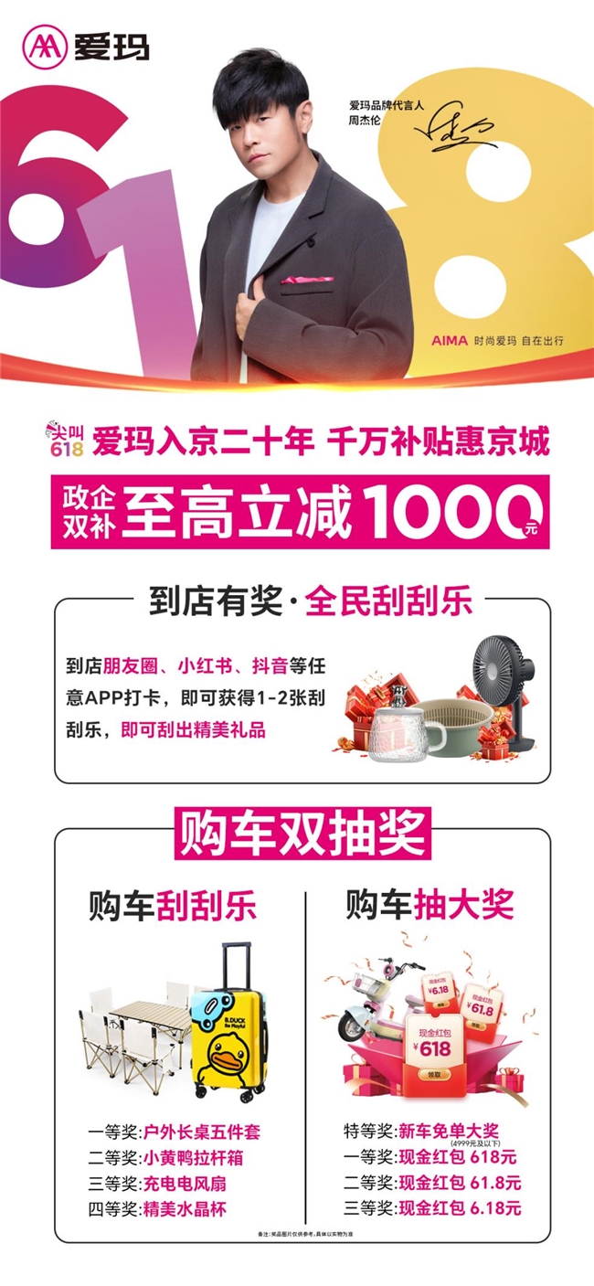 同時,在活動期間購車的用戶,都將獲得“購車刮刮樂”與“購車抽大獎”雙重抽獎機會,不僅有機會贏取戶外長桌五件套、小黃鴨拉桿箱、充電風扇、精美水晶杯等兼具時尚與實用的獎品,以及618元、61.8元、6.18元的現(xiàn)金紅包,手氣爆棚的話更可獲得針對4999元以下車型的新車免單大獎。甚至,哪怕沒有當場購車,在活動期間凡光臨北京區(qū)域愛瑪門店并使用小紅書、微信朋友圈、抖音等APP打卡的消費者,都將獲得“全民刮刮樂”,刮開即有機會獲得精美禮品。