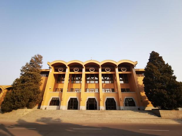 △“開學(xué)第一課”的地點(diǎn)——中共中央黨校禮堂。建成于1959年9月。建筑外墻采用黃缸磚貼面,屋頂為拱型薄殼結(jié)構(gòu)。屋檐下方鑲有五個圓型空心花飾,既代表中國陜北特色的窯洞風(fēng)格,又體現(xiàn)蘇式建筑的特點(diǎn)。它是由建筑設(shè)計師戴念慈設(shè)計的。(央視記者張曉鵬拍攝)