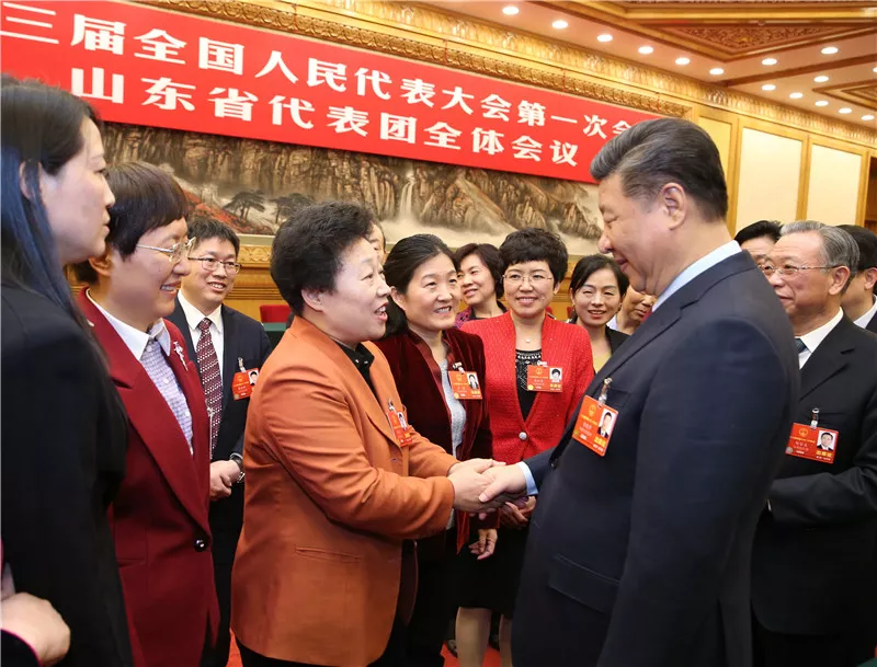 △2018年3月8日,習(xí)近平到山東代表團(tuán)參加審議。正值“三八”國(guó)際勞動(dòng)?jì)D女節(jié),習(xí)近平代表黨中央向女代表、女委員、女工作人員及全國(guó)各族各界婦女同胞,致以節(jié)日的祝賀和誠(chéng)摯的祝福。