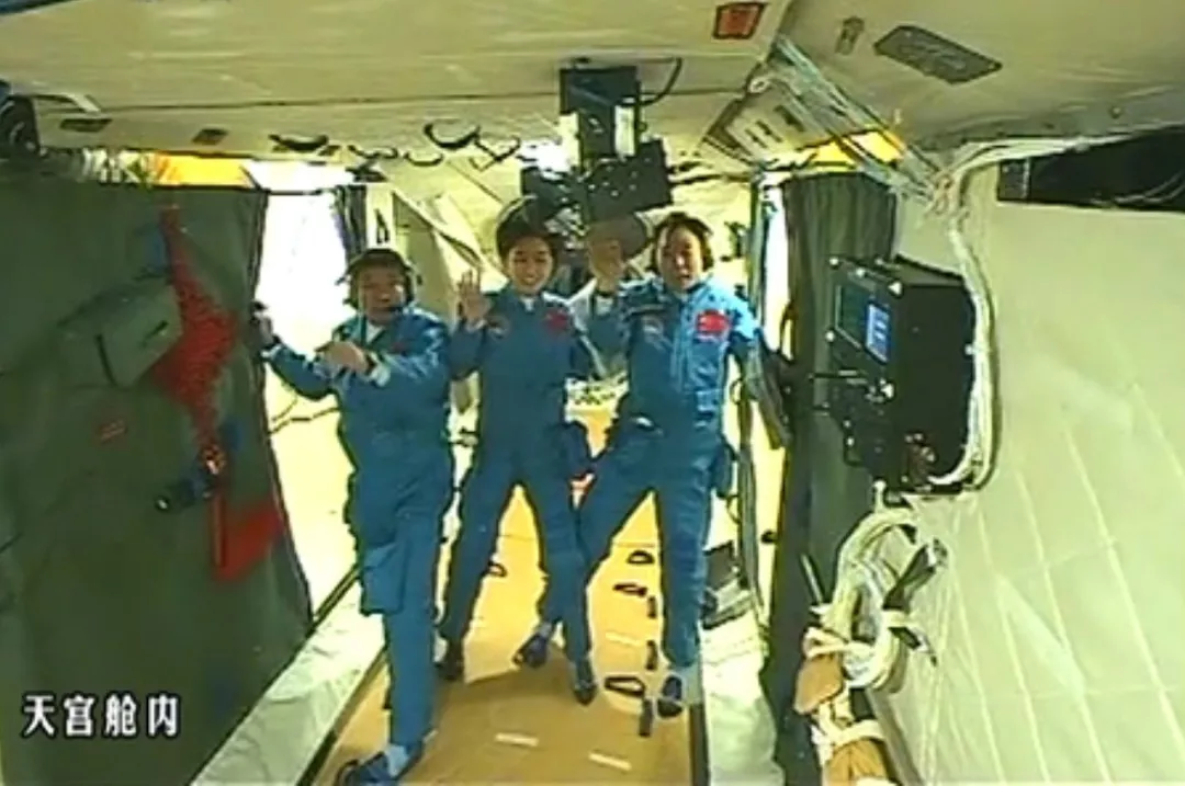 △2012年6月,神舟九號(hào)三位航天員景海鵬(右)、劉旺(左)、劉洋(中)在天宮一號(hào)艙內(nèi)拍下首張全家福,向祖國(guó)人民揮手致意。
