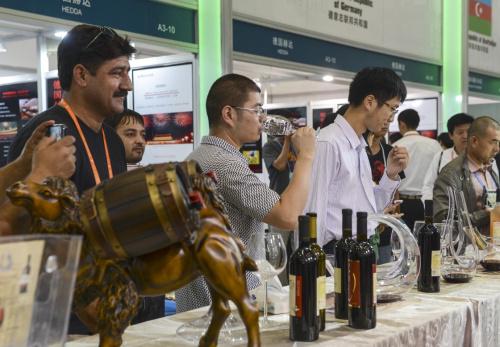 在第三屆中國—亞歐博覽會上,參觀者在格魯吉亞展區(qū)品嘗紅酒(2013年9月3日攝)。