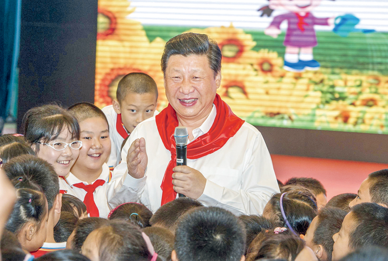 2014年5月30日上午,中共中央總書記、國家主席、中央軍委主席習(xí)近平來到北京市海淀區(qū)民族小學(xué),參加慶!傲弧眹H兒童節(jié)活動。這是習(xí)近平在參加少先隊入隊儀式時,向少先隊員們致以節(jié)日問候。新華社記者謝環(huán)馳/攝