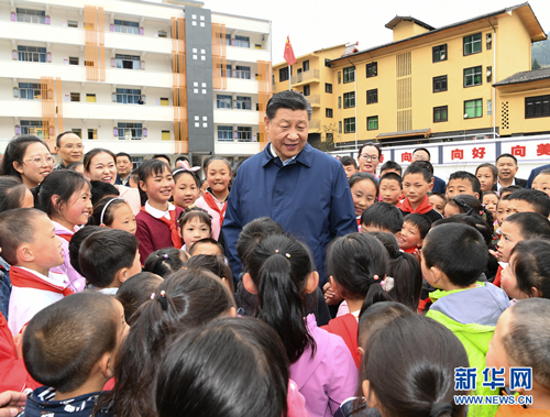 2019年4月15日下午,習近平在石柱土家族自治縣中益鄉(xiāng)小學同師生親切交談,了解義務教育保障情況。 新華社記者 謝環(huán)馳 攝