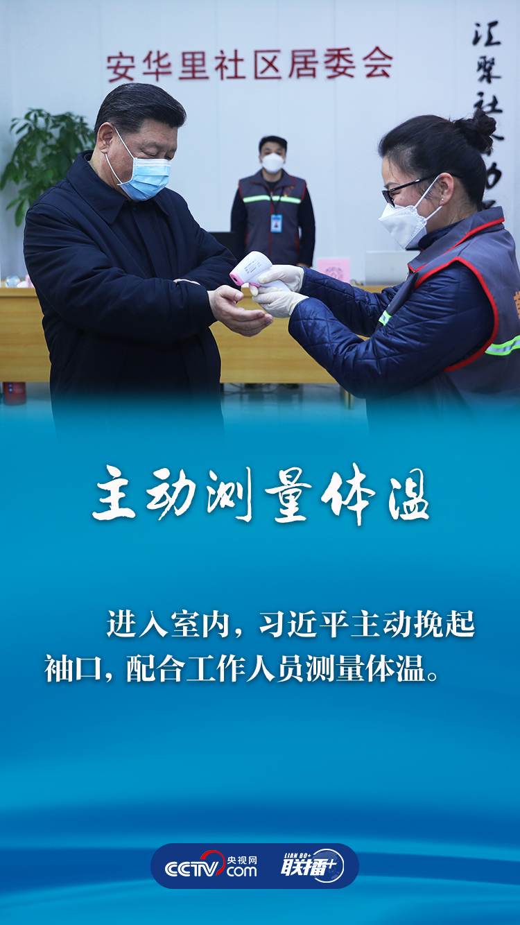 調(diào)研指導(dǎo)工作期間,習(xí)近平全程佩戴口罩,進入室內(nèi)主動測量體溫,與群眾暖心交流時不忘溫馨提醒“非常時期就不握手了”......他以身作則、帶頭做好疫情期間防護,為百姓堅持加強防護做好表率。