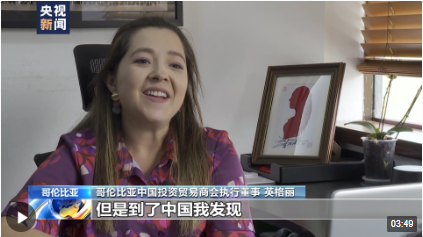 哥倫比亞中國投資貿(mào)易商會執(zhí)行董事 英格麗:我的老公是在中國認識的,是哥倫比亞人。他也會說中文,我們現(xiàn)在都是在從事和中國企業(yè)有關(guān)的工作,這個是中國給我們最大的機會。非常感謝中國。我們兩個人的工作都和中國有關(guān)系,所以我們會關(guān)注中國企業(yè)在哥倫比亞可以處理發(fā)展咱們的生意,比如說商會每一年有舉辦一個活動,叫中國哥倫比亞對話。這個活動的目的就是中國企業(yè)和哥倫比亞政府談一下他們的共同題目,比如說建設(shè)項目或者技術(shù)合作。